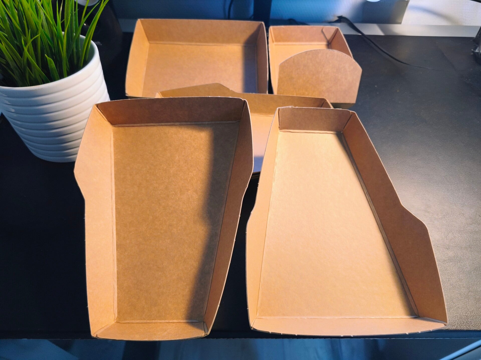 Barquette composée de 95% carton avec une barrière PE intégrée, adaptée à l’usage alimentaire.
