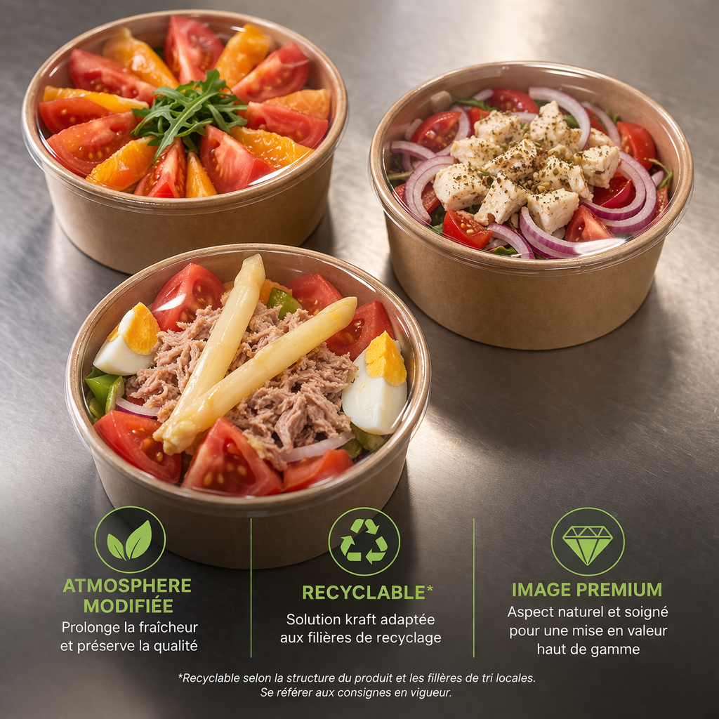 Les saladiers kraft compatibles atmosphère modifiée (MAP) permettent d’associer présentation haut de gamme, meilleure conservation et réduction de l’usage du plastique visible.